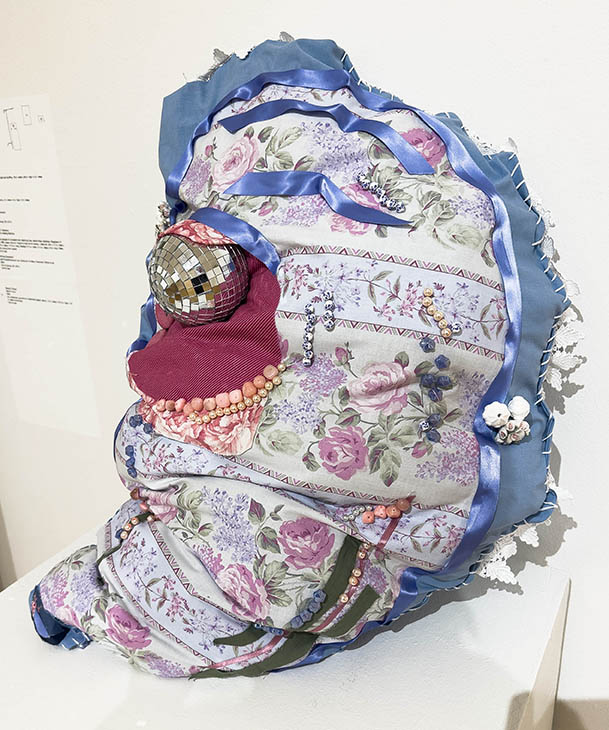 Lydia Laslavic’s piece, “Oystah,” is a fabric “pillow” with beads, ribbons and a disco ball that has a colorful, soft aesthetic.