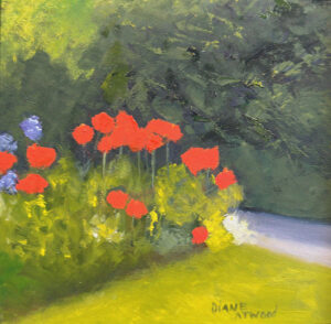A good example is the piece “Red Poppies.” Green brush strokes blend and create an environment for the poppy flowers to flash off the surface in a bright red. Another effective piece is “Countryside Gate.” Here her technique effectively suggests the light through the clouds around the foliage, rocks, and gate.
