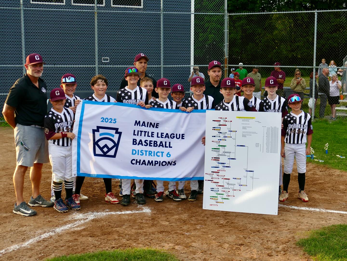 Congratulations. For the first time since moving from the Cal Ripken league, Gorham Little League are District 6 champions. The team defeated Falmouth winning in extra innings July 10. They finished the tournament with a 5-0 record. The team now moves on to the State championship which takes place in Machias. Updates on the State tourney will be available in a future edition.